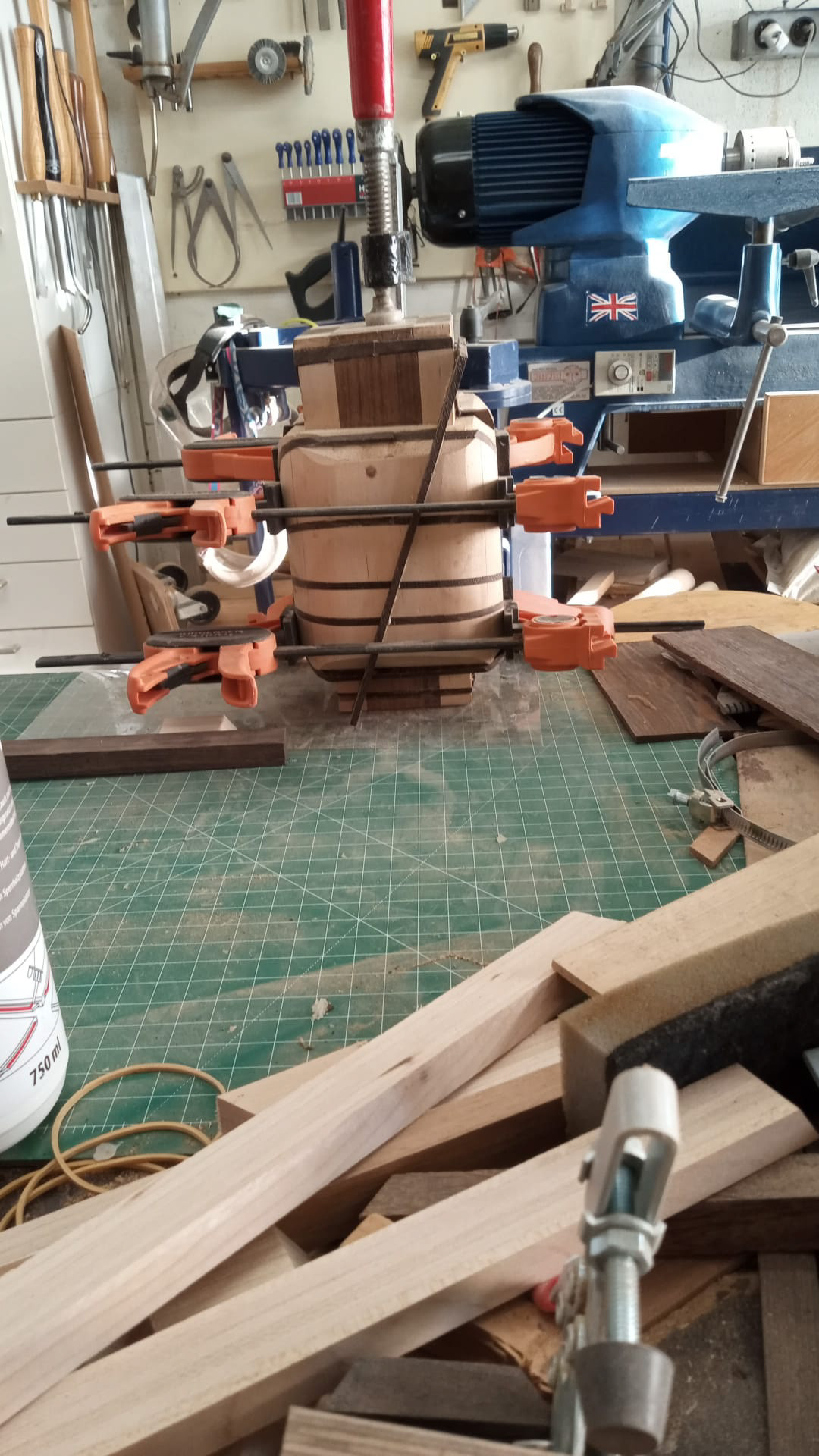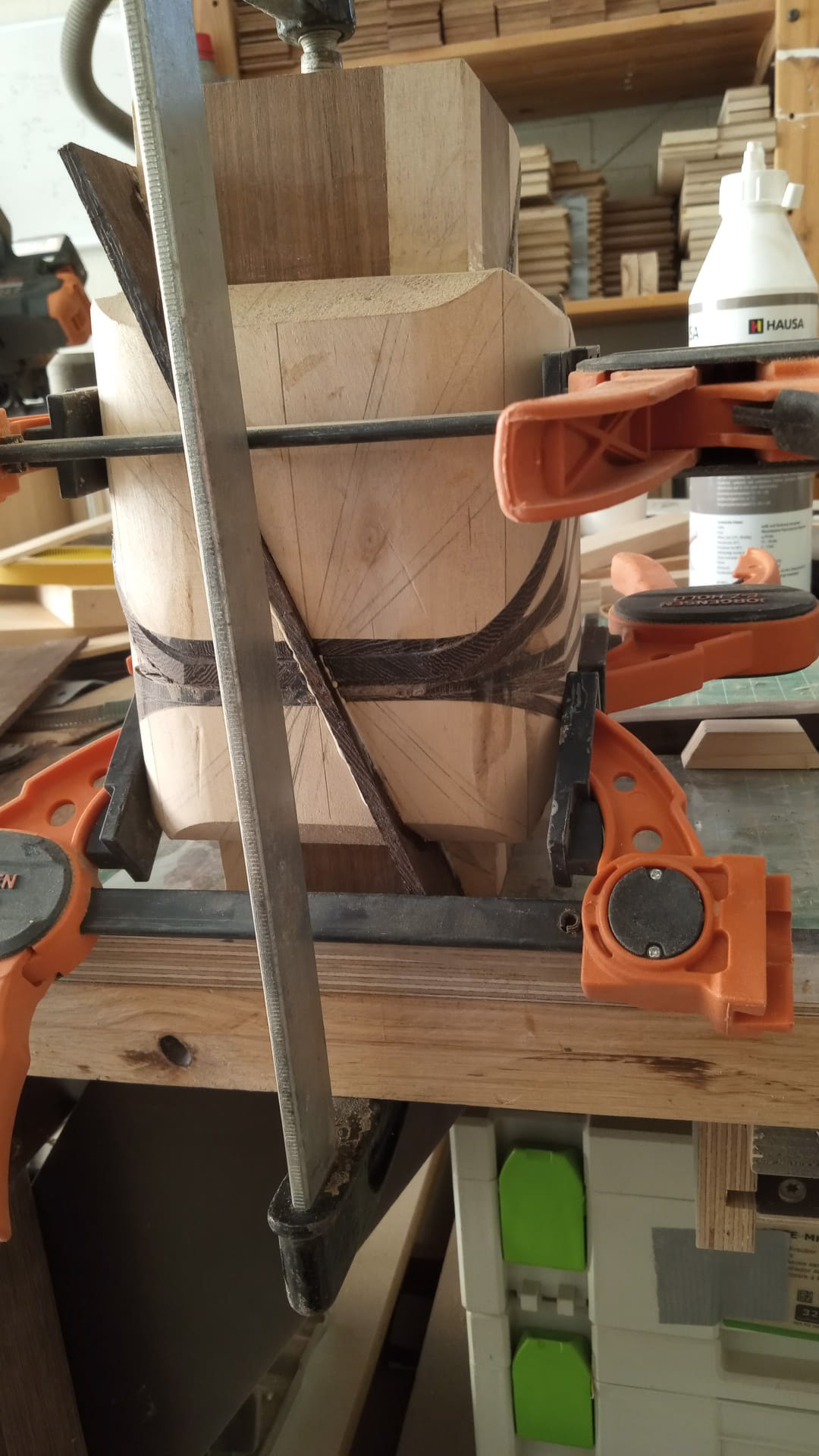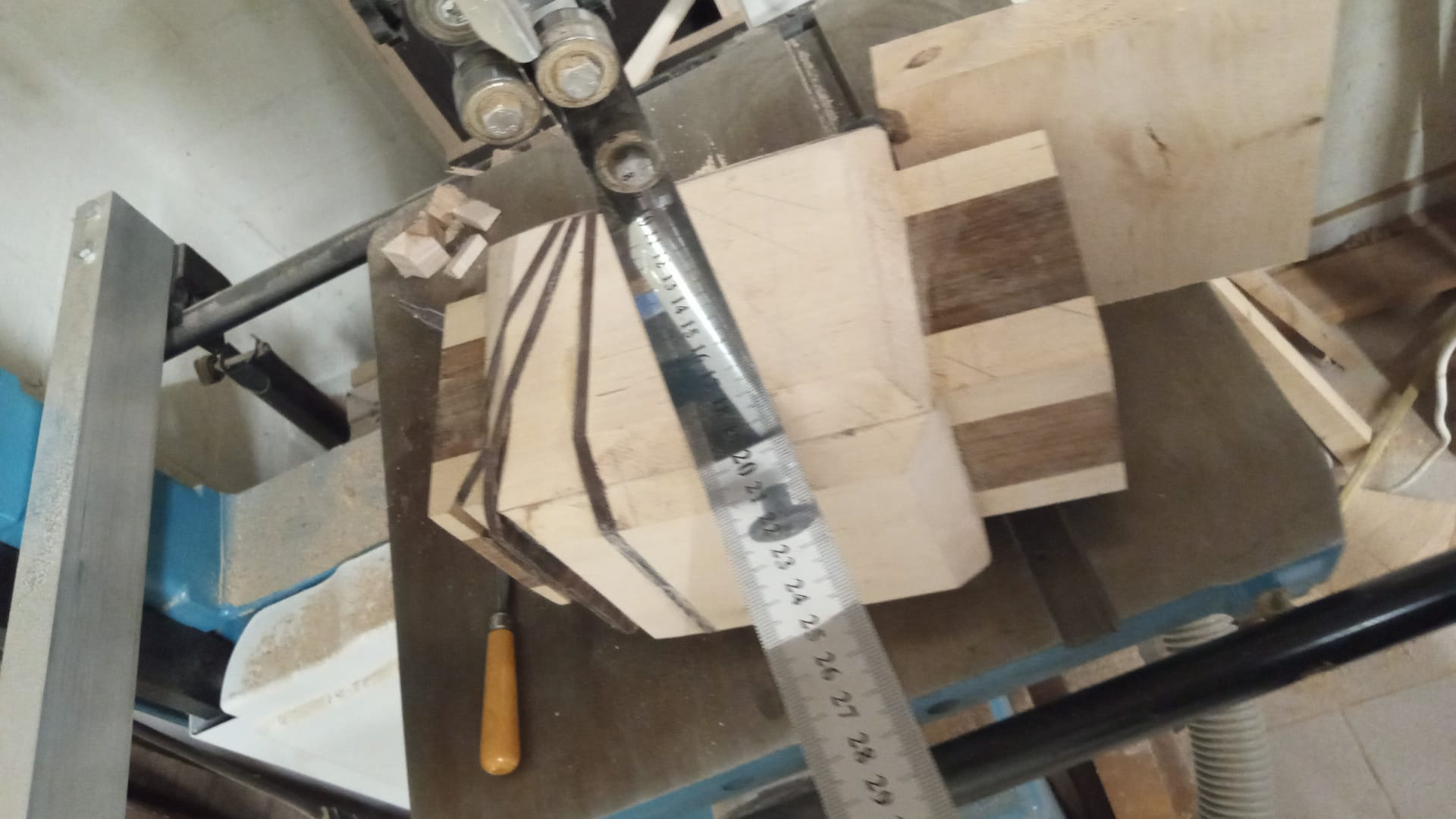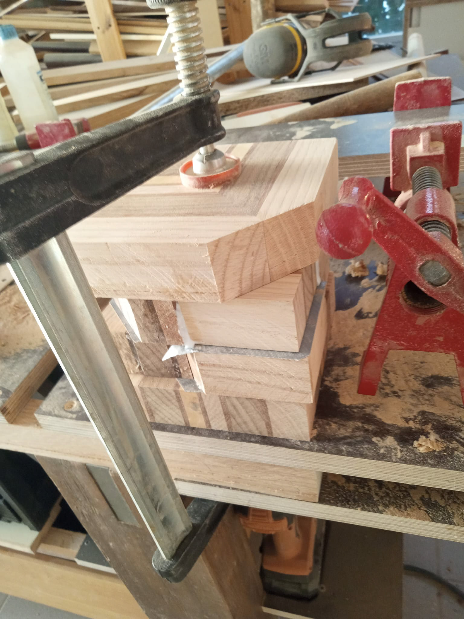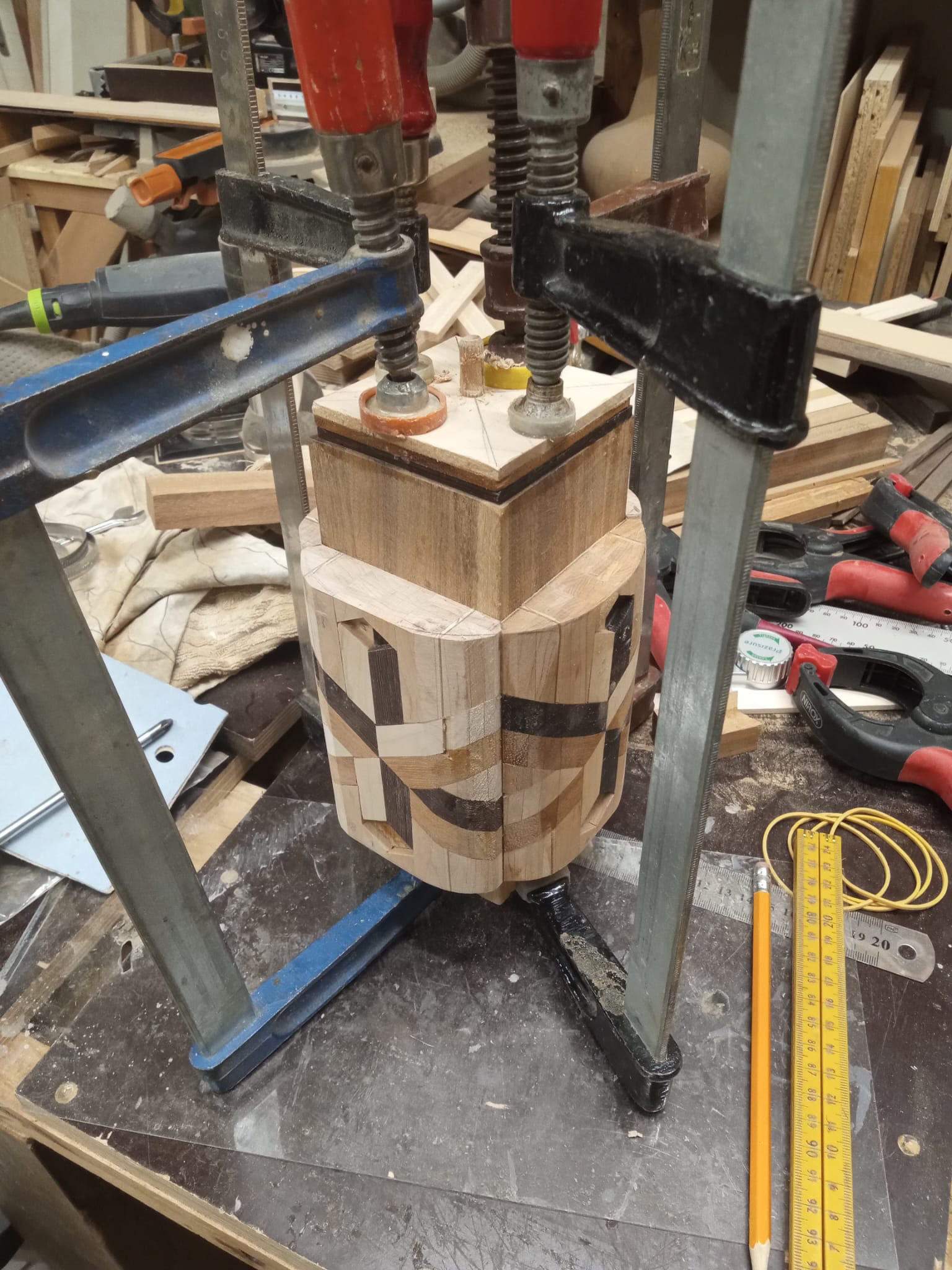 My latest work was inspired by a table I made using pieces of an old wooden staircase paired with left-over pieces of wooden flooring. The staircase pieces were not thick enough, but the wooden flooring was - combining the two was the solution and led to my first geometric design. My thoughts after finished the table: "this table deserves a matching vase". And so it began.